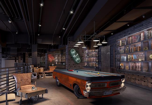 深圳装修设计的餐厅主打的是复古风格,色调以深棕色为主,大面积的运用了粗糙的红砖墙作为墙面,运用了旧招牌,有年代感的发光标识作为墙面的装饰,加上复古灯具与复古家具相互配合打造出来独特的复古风格的空间,体现出浓厚的历史沉淀感,有浓厚的复古氛围,也提高了餐厅的艺术层次感。在层高优势下搭建出隔层空间,不仅充分运用了空间,还让整个空间具有了层次感。天马行空的将废旧的汽车与台球桌拼接起来,如同艺术品一样,更加别具一格。